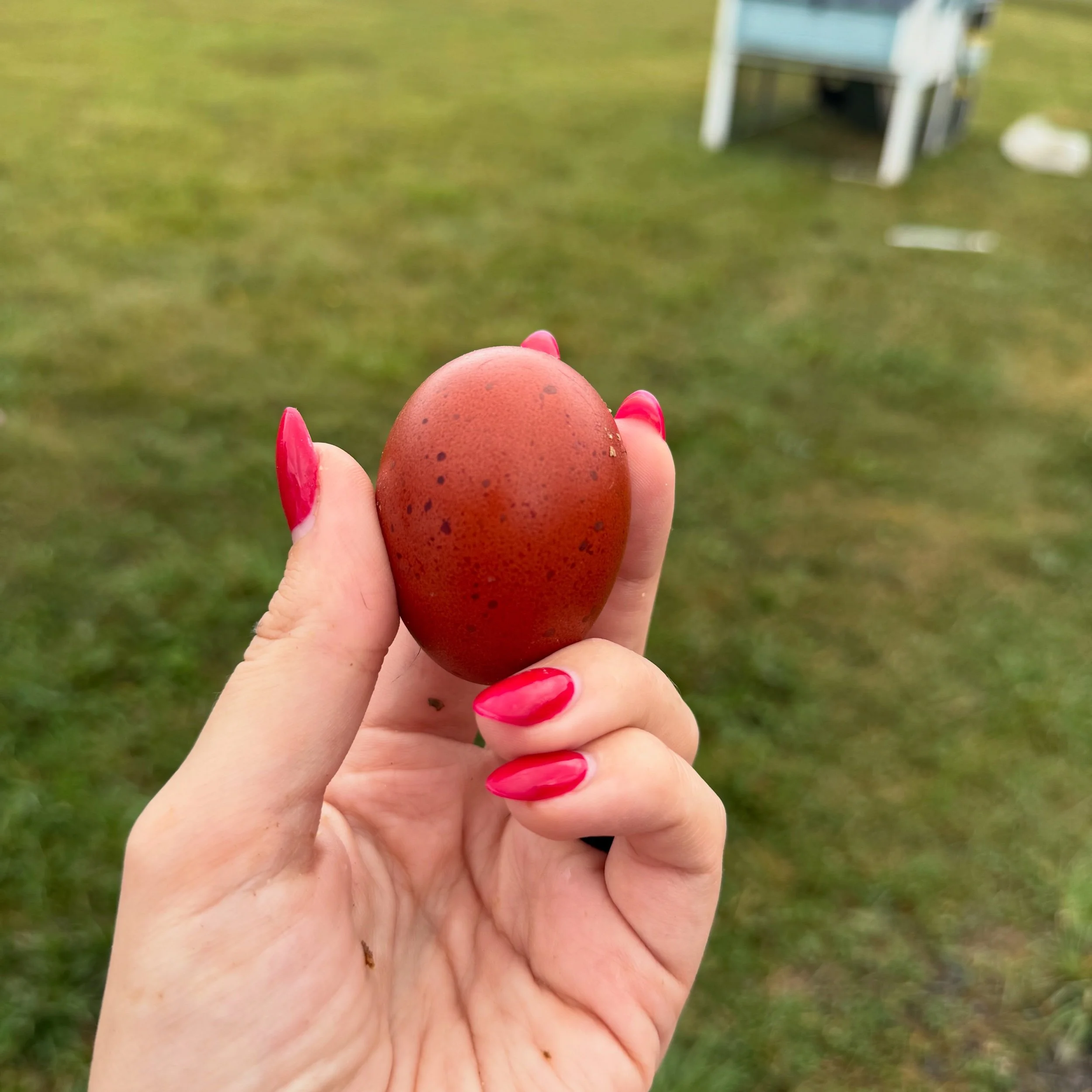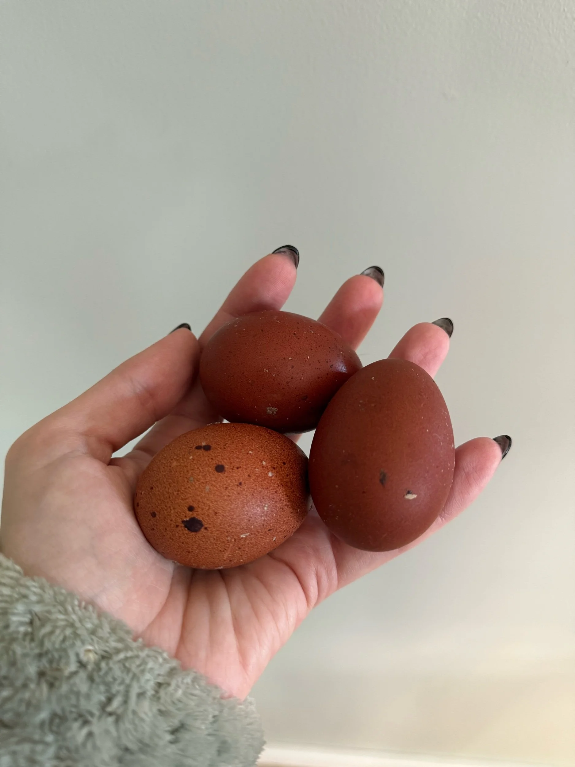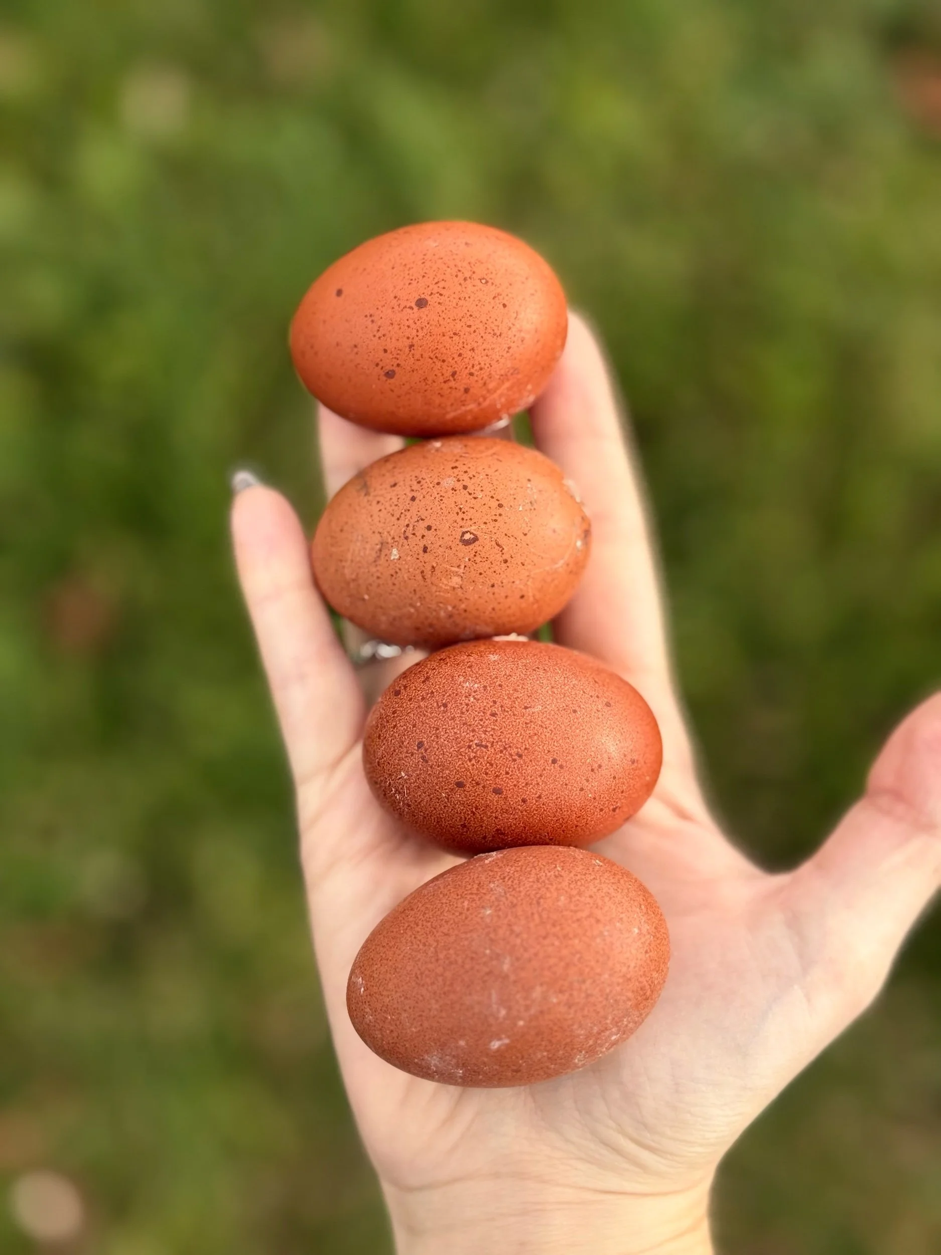 Our speckled black Copper Marans are prized for their deep, chocolate-brown eggs, often with natural speckling and a rich, glossy finish. Our two pens consists of 16 hens per, covered by two roosters hatched from level 8 & 9 eggs.