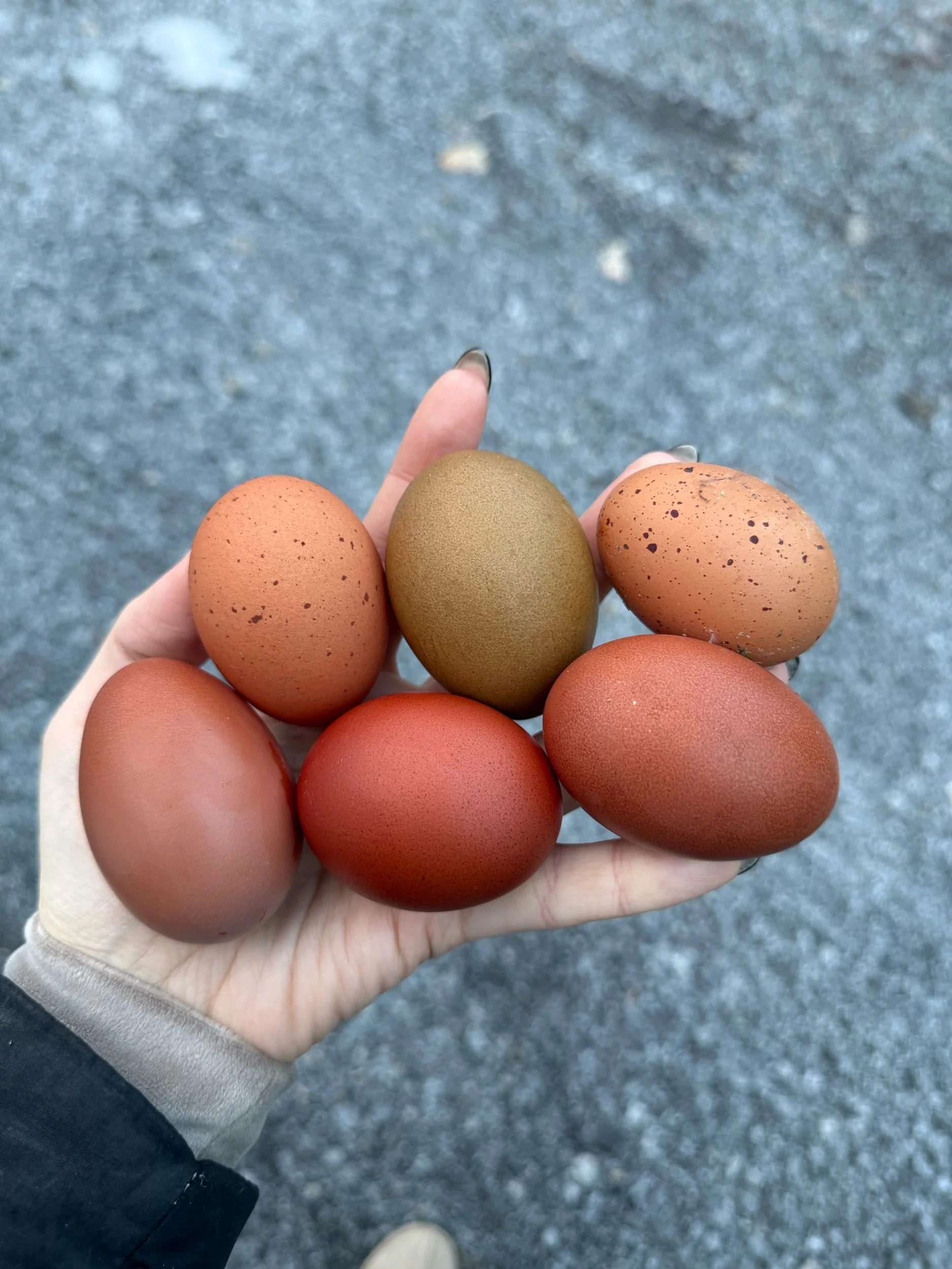 These are not purebred lines—they’re intentionally mixed to maximize color diversity, bloom coverage, speckling, and overall beauty. Every egg is a surprise, and every chick is a unique creation you won’t find in a hatchery catalog. This whole line is covered by a heavy bloom black copper marans rooster. If we have extra eggs from our Crele Penedesenca pen, they’ll be labeled.