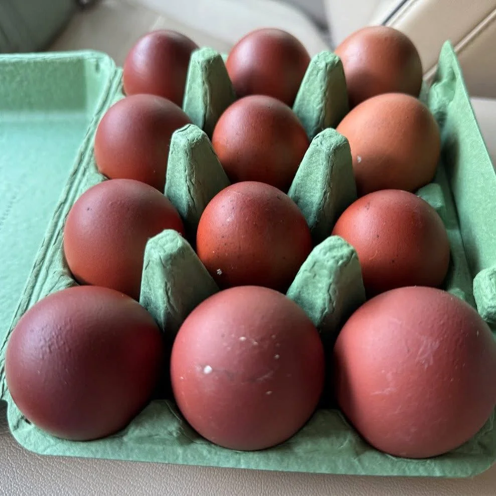 Our Crele Penedesenca are highly regarded for their striking crele plumage and their signature dark chocolate-brown eggs, often finished with a smooth sheen and occasional natural bloom.